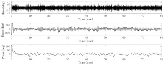 By subtracting the middle line of the upper and lower envelope from the raw phase sequence data, the phase signal mainly composed of the heartbeat signal, radar system noise and residual respiratory harmonics can be obtained, whose signal waveform is shown in Figure 14.