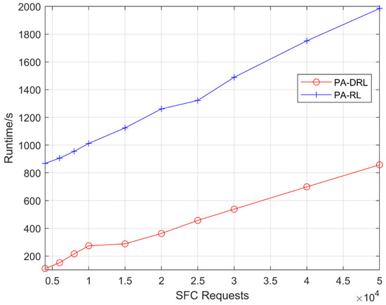 Runtime of PA-DRL and PA-RL under each SFC requests number.