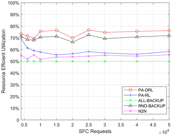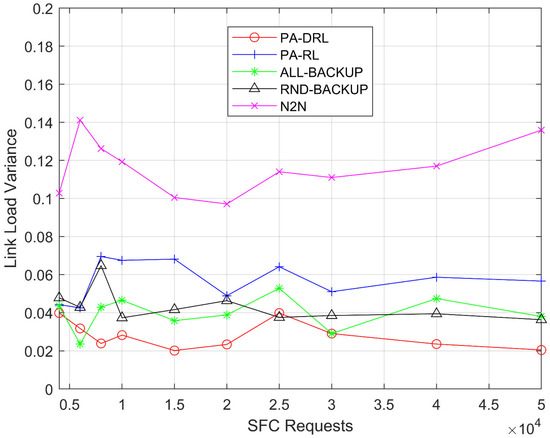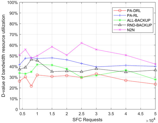 As mentioned above, in order to measure the load balancing of links, Figure 9 shows the D-value between maximum and average link resource utilization of proposed PA-DRL algorithm and other four baseline algorithms. Intuitively, there are three facts in Figure 9. Firstly, the D-value of PA-DRL is the lowest, because PA-DRL uses deep reinforcement learning to process deployment, which can optimize the target better compared with other algorithms, so the performance is the best. Secondly, RND-BACKUP, ALL-BAKCUP, and PA-RL algorithms’ performances are similar and better than N2N, because they all use machine learning to optimize target, which can get better performance in large-scale requests environment than LP algorithm. Finally, the performance of N2N is the worst, because N2N is based on LP algorithm, its optimization performance can only be maintained to a certain extent, and cannot get better results with the increase of SFC requests.