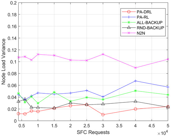 Figure 6 shows the network node load variance for PA-DRL, ALL-BACKUP, RND-BACKUP, RL, and N2N models in terms of SFCs number. Firstly, it can be easily observed that the performance of PA-DRL is the best, because we use maximum CPU usage as optimization goal in feedback function, the performance will be the best through learning process. Secondly, the variance of RND-BACKUP and ALL-BACKUP models are higher than PA-DRL and lower than PA-RL. On one hand, because they utilize maximum node load to optimize the load balancing of nodes, and then, deep reinforcement learning algorithm is more advanced than reinforcement learning in choosing action for unknown samples. On the other hand, because they determine the backup scheme without priority level, the backup scheme of each VNF is worse than PA-DRL, thus, their performances of nodes’ load balancing are worse than PA-DRL. Thirdly, the PA-RL’s performance is worse than PA-DRL algorithm, because reinforcement learning is worse than deep reinforcement learning when making accurate judgements about unknown situations in the sample. Last but not least, the variance of N2N algorithm is the highest, because the feedback functions of PA-DRL and PA-RL consider nodes’ load balancing by maximum CPU usage, these algorithms tend to deploy VNF on node with more resources. Thus, they are more advanced than N2N’s optimization function under each SFC requests number.