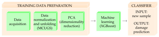 Previous studies focused on structural damage classification using multisensor systems; they used several ML algorithms and data reduction for pattern recognition. For instance, PCA [28], self-organizing maps (SOM) [29], kNN [30], artificial immune systems (AIS) [31], SVMs [32], and t-distributed stochastic neighbor embedding (t-SNE) [33,34]. This study presents a structural damage classification methodology for pattern recognition and signal processing in sensor networks that achieves good classification performance and advantages in calculation time to continue the improvement and development of damage classification methodologies. This methodology is composed of different stages: normalization of the signal considering the differences in magnitudes obtained by the sensors; linear feature extraction; and dimensionality reduction via the PCA method to form a feature vector that will serve as input to an extreme gradient boosting ML classifier algorithm. This methodology was validated using a small-scale wind-turbine jacket foundation. In addition, a 5-fold cross-validation procedure was performed to determine the average classification performance measures of an unbalanced classification problem showing excellent results.