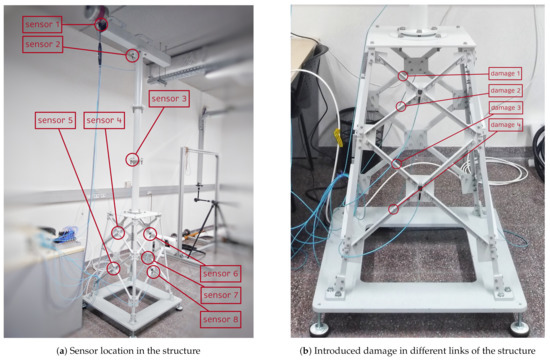 The structure of a small-scale wind-turbine foundation is used to validate the damage detection and localization methodology developed in this study. This benchmark structure, based on the one designed by Zugasti [35], was considered by Hoxha et al. [36], Vidal et al. [7], and Puruncajas et al. [13] to validate different approaches for structural damage detection and classification experimentally. The benchmark structure—placed in the CoDAlab laboratory (Escola d’Enginyeria de Barcelona Est, Universitat Politècnica de Catalunya, Barcelona, Spain)—is shown in Figure 3a; it is composed of three parts: (i) the nacelle on the top, (ii) tower in the middle, and (iii) jacket on the bottom. The total height of the structure is m. The jacket was made of steel bars and bolts. A 5 mm crack was introduced at four different bars located in the jacket structure, one at a time. It can be said that the 5 mm crack damage is small for this structure [35] and therefore hard to detect. Summarizing, four different damage scenarios are considered in this study, as shown in Figure 3b.