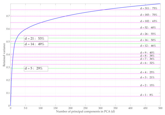 Let , where denotes the total number of features of the data and is the matrix that collects all samples defined in Equation (3). Feature extraction techniques aim to discover a low-order model of dimension , which properly represents the variability of , thereby eliminating redundancies. The aim is to determine a reduced d-dimensional manifold described by the transformed matrix retaining most of the information or variance of the original matrix , where the variance of a matrix (which coincides with its squared Frobenius norm) is defined as