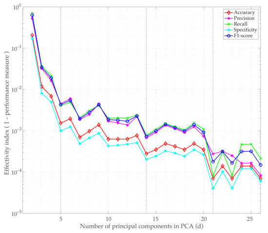 - Data transformation: a dimensionality reduction stage is applied to perform feature extraction and reduce the bid data obtained with the sensors using PCA. The selection of the number of principal components is done according to the average classification accuracy obtained with the methodology. The best results were obtained when considering 21 principal components as relevant features, which only account for of the variance and represents a of data reduction.