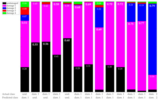 - Four of the columns ( and 13) are associated with samples where the classifier detects both characteristics of damage 1 and damage 2 structures, even though it correctly detects the predominant class (correct prediction) in all cases.