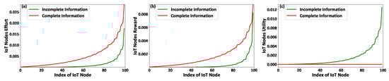 IoT nodes’ (a) invested effort, (b) gained reward, and (c) achieved utility under the proposed contract-theoretic energy harvesting framework—Complete versus Incomplete information scenarios.