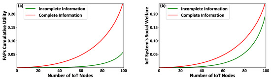 (a) FAPs’ cumulative utility and (b) the overall IoT system’s social welfare under the proposed contract-theoretic energy harvesting framework—Complete versus Incomplete information scenarios.