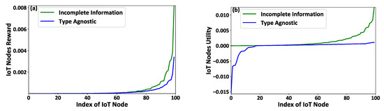 Figure 2a–c present the IoT nodes’ effort , the FAPs’ reward , and the IoT nodes’ achieved utility as a function of the IoT nodes’ types considering the scenarios of complete and incomplete information. It is noted that the IoT nodes’ types are sorted for presentation purposes, i.e., . The results reveal that the IoT nodes of higher type, i.e., better socio-physical conditions, invest more effort (Figure 2a) by transmitting with higher transmission power to report more data to the corresponding FAPs that they are associated with. Thus, following the fairness (Proposition 1) and monotonicity (Proposition 2) conditions, the IoT nodes of higher type enjoy a higher reward (Figure 2b) from the FAPs, i.e., higher charging power. Therefore, based on the rationality (Proposition 3) condition, the IoT nodes of higher type achieve a higher utility, as shown in Figure 2c. Furthermore, it should be noted that the FAPs provide the minimum possible rewards to the IoT nodes under the complete information scenario given that they know their socio-physical characteristics; thus, (Figure 2c).