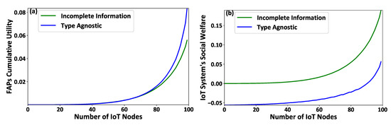 (a) FAPs’ cumulative utility and (b) the overall IoT system’s social welfare—A Comparative Evaluation.