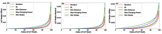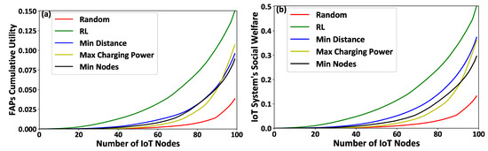 Figure 6a–c present the IoT nodes’ invested effort, gained reward, and achieved utility, respectively, as a function of the IoT nodes’ IDs. Figure 7a,b illustrate the FAPs’ cumulative utility and the overall IoT system’s social welfare, respectively, as a function of the number of IoT nodes within the overall system. The results show that the proposed framework outperforms compared to all other scenarios, in terms of IoT nodes’ invested effort (Figure 6a), gained reward (Figure 6b), and achieved utility (Figure 6c), FAP’s cumulative utility (Figure 7a), and system’s social welfare (Figure 7b). This observation stems from the proposed reinforcement learning mechanism’s inherent characteristics that enable the IoT nodes to select the FAPs that hollistically provide them with a superior utility in the long term, as compared to considering only fragmented selection criteria, such as the minimum distance, the maximum charging power, and/or the minimum number of connected IoT nodes to the FAPs. It is also observed that FAP selection based on the minimum distance presents the next best results after our proposed reinforcement learning-based framework, as the communication distance is a dominant factor in both the transmission and charging signals’ power attenuation. The random selection scenario presents the worst results, as the IoT nodes make a non-sophisticated selection of FAPs without considering their physical and social characteristics. The Max Charging Power and Min Nodes FAP selection scenarios present similarly mediocre results, as all the IoT nodes tend to select only one FAP per timeslot, and this type of selection creates a burden on the selected FAP to serve all the connected IoT nodes efficiently.