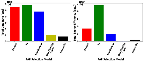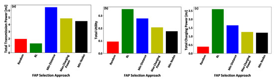 Furthermore, Figure 8a–c illustrates the total transmission power and utility of all the IoT nodes, and the total charging power of all the FAPs, respectively, for all the examined comparative scenarios. The results demonstrate that the proposed reinforcement learning-based FAPs’ selection mechanism enables the IoT nodes to transmit with low power (Figure 8a) and efficiently exploit the FAPs’ charging power (Figure 8c), in order to achieve superior utility (Figure 8b) within the examined IoT system. On the other hand, the single selection criterion of FAPs scenarios present worse results, as they provide a myopic view to the IoT nodes regarding the IoT system, and their most beneficial choice of FAP to be connected and transmit information, while also harvesting power. Additionally, the random scenario provides the lowest utility to the IoT nodes, as it is not able to efficiently balance the trade-off between the energy spent to transmit the IoT nodes’ data and the corresponding harvested energy from the FAPs’ radio frequency signals.