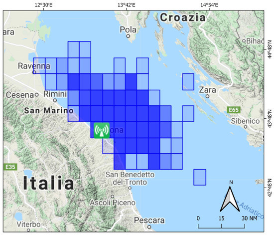 Terrestrial AIS (t-AIS) data were collected with a poll rate of 2–5 min from a land-based receiver (Comar SLR300N–PHP dispatcher (http://www.ais.dii.univpm.it, accessed on 12 April 2021)) that is installed on the roof of the Università Politecnica delle Marche, at a height of 205 m above the sea level. Accordingly, the study area was chosen to cover the coverage area (see Figure 1) of selected receiver (a radius of approximately 45 nm around the port of Ancona).