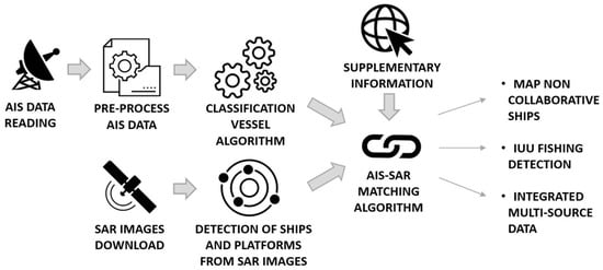Given their distinct limitations, the synergic exploitation of both the above-mentioned data represents a breakthrough to strongly improve MDA and effectively monitor fishing activities [27,28]. It results in the quantification and additional mapping of the non-reporting ship traffic and gives a more complete and informative picture of vessels’ activity, including Illegal, Unreported and Unregulated (IUU) fishing [29]. The combined use of cooperative and non-cooperative sources has already been proposed in the literature to increase the potential of the single data source in classifying ships [30,31,32], investigating related behavior [33,34] and detecting abnormal activities [35]. Zhao et al. [36] proposed a point-to point association with merge AIS and SAR data using an iterative process based on the minimum distance criteria between the AIS and SAR positions [37], while Mazzarella et al. [33] increased the quality of SAR/AIS fusion by exploiting knowledge of historical vessel positioning information. Park et al. [38] combined for the first time four satellite technologies to publicly reveal large-scale illegal activities by dark fleets operating in North Korean waters. Their method worked only when there were AIS positions relatively close in time to the images, and for many scenes, because of poor AIS reception or vessels not broadcasting, such matching was not possible.