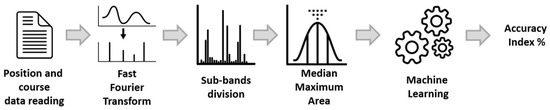 Prior to this, a Fast Fourier Transformation (FFT) was applied on position and course data (using the pspectrum [46] Matlab function), and the performance was improved by subdividing each spectrum twice into 20 and 100 power sub-bands from which additional features (median, maximum and area of single sub-bands) were extracted and added to the feature space. This choice was given by the right tradeoff between speed of execution and performance obtained.