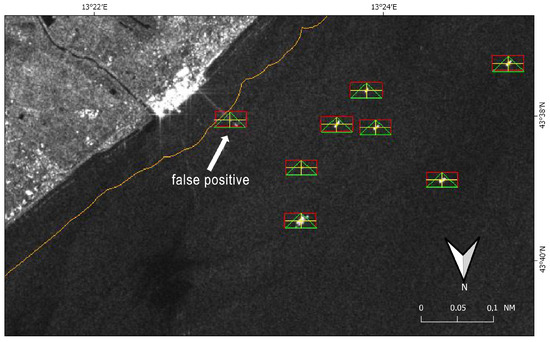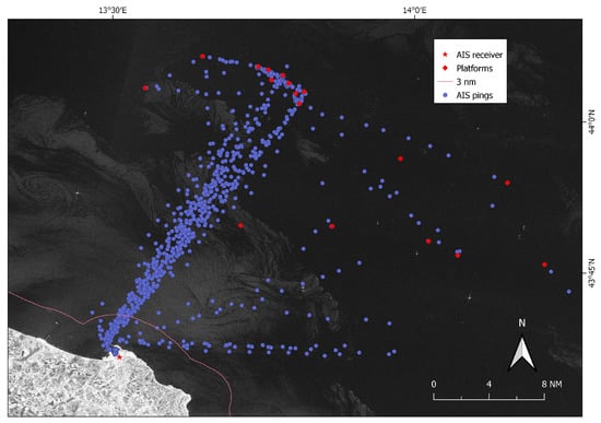 Positions of the offshore gas platforms were downloaded from the EMODnet–Human Activities web portal [49] and used to confirm those targets that were fixed in repeat-pass imagery as false alarms. They were excluded before passing the detected SAR targets to the matching algorithm. Additional buffer layers were created and used to investigate suspicious behavior, such as those within the 3 nm offshore the coastline and within the 500 m safety zones surrounding the offshore platforms.