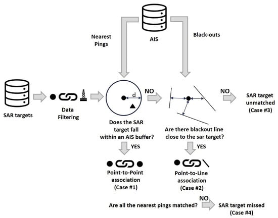 For each target, both Cases #1 and #2 were checked before labeling the SAR detection as unmatched (Cases #3). At the end of the for loop, all the non-associated AIS data were assigned to Cases #4.