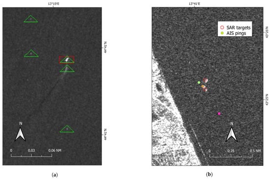 Sentinel-1 image taken on 2019-07-19 and a false positive due to a ship’s wake (inter-target distance ≤150 m). Green triangle and the red rectangles are objects detected in VH and VV, respectively (a). Close-up view of the 3 nm costal area (VH channel). 3 AIS positions were reported by a PTM (green ping), a cargo/cruise (orange ping) and a small OTB (pink) that according to its AIS, was below the limit of detectability for SUMO (b).