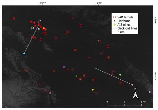 Close-up view of the Sentinel-1 image taken as example (VV channel), overlaying 41 SUMO/SAR detections, 9 AIS reported positions, 3 AIS blackouts and 6 offshore platforms. The starting vertex of the blackout entering the managed area of platform p2 is at the same time (for the given MMSI) the ping nearest to the SAR epoch (cyan AIS position).