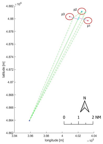 Graphical representation of a suspicious blackout (green line) in proximity of an offshore gas field (platforms p1, p2 and p3). Blu points consist of the latest ping before the switching off and first available ping after the power on, while cyan markers are the contact points between the 500 m safety zones (red circles) and the minimal potential routes (dashed green lines) that the vessel could follow to enter the forbidden areas.