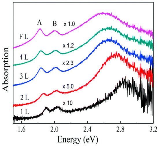 - Dhakal, K.P.; Duong, D.L.; Lee, J.; Nam, H.; Kim, M.; Kan, M.; Lee, Y.H.; Kim, J. Confocal absorption spectral imaging of MoS2: Optical transitions depending on the atomic thickness of intrinsic and chemically doped MoS2. Nanoscale 2014, 6. [Google Scholar] [CrossRef]