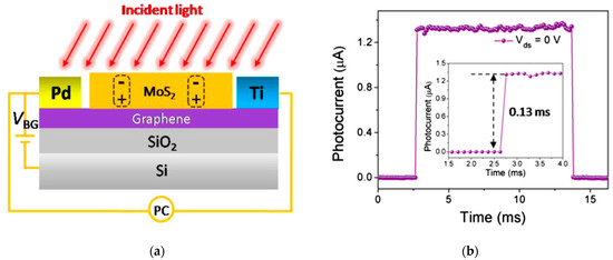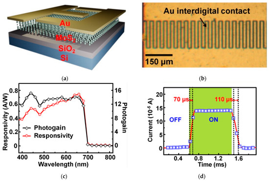 - Tsai, D.S.; Lien, D.H.; Tsai, M.L.; Su, S.H.; Chen, K.M.; Ke, J.J.; Yu, Y.C.; Li, L.J.; He, J.H. Trilayered MoS2 metal-Semiconductor-metal photodetectors: Photogain and radiation resistance. IEEE J. Sel. Top. Quantum Electron. 2014, 20, 3800206. [Google Scholar] [CrossRef]