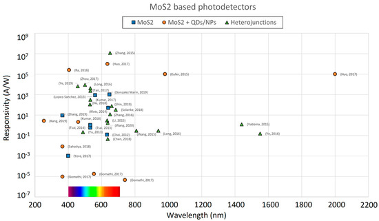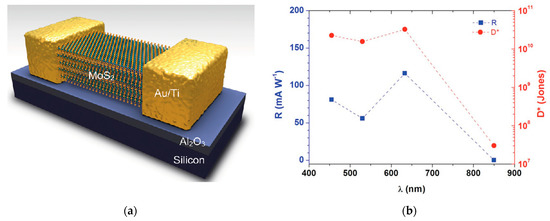 | Photoactive Material | Technology | MoS2 Layers | Wavelength (nm) | Responsivity (A/W) | Response Time (s) | Detectivity (Jones) | Dark Current (A) | Ref. | |