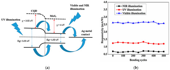 - Sahatiya, P.; Jones, S.S.; Badhulika, S. 2D MoS2–carbon quantum dot hybrid based large area, flexible UV–vis–NIR photodetector on paper substrate. Appl. Mater. Today 2018, 10, 106–114. [Google Scholar] [CrossRef]