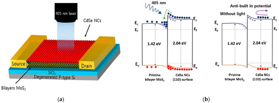 - Ra, H.S.; Kwak, D.H.; Lee, J.S. A hybrid MoS2 nanosheet-CdSe nanocrystal phototransistor with a fast photoresponse. Nanoscale 2016, 8, 17223–17230. [Google Scholar] [CrossRef]