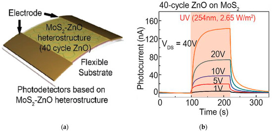 - Kang, M.A.; Kim, S.; Jeon, I.S.; Lim, Y.R.; Park, C.Y.; Song, W.; Lee, S.S.; Lim, J.; An, K.S.; Myung, S. Highly efficient and flexible photodetector based on MoS2-ZnO heterostructures. RSC Adv. 2019, 9, 19707–19711. [Google Scholar] [CrossRef]