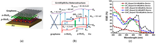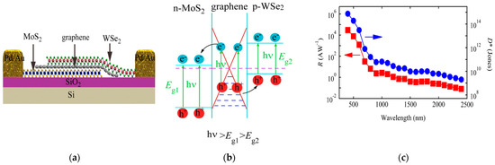 - Wi, S.; Chen, M.; Nam, H.; Liu, A.C.; Meyhofer, E.; Liang, X. High blue-near ultraviolet photodiode response of vertically stacked graphene-MoS2-metal heterostructures. Appl. Phys. Lett. 2014, 104, 232103. [Google Scholar] [CrossRef]
