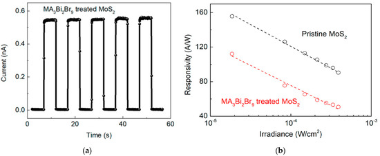 - He, J.; Yang, Y.; He, Y.; Ge, C.; Zhao, Y.; Gao, L.; Tang, J. Low Noise and Fast Photoresponse of Few-Layered MoS2 Passivated by MA3Bi2Br9. ACS Photonics 2018, 5, 1877–1884. [Google Scholar] [CrossRef]