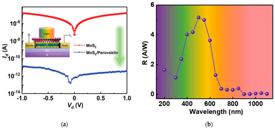 - Wang, H.; Wang, X.; Chen, Y.; Zhang, S.; Jiang, W.; Zhang, X.; Qin, J.; Wang, J.; Li, X.; Pan, Y.; et al. Extremely Low Dark Current MoS2 Photodetector via 2D Halide Perovskite as the Electron Reservoir. Adv. Opt. Mater. 2020, 8, 1901402. [Google Scholar] [CrossRef]