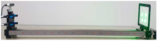 To verify the proposed method for detecting and quantifying surface damage on concrete structures, experiments with structured lights and a depth camera were conducted. As shown in Figure 4, four lasers were projected on the concrete structures, and a depth camera on the same side of lasers captured the image of the structures while measuring the distance. The experiments used an LDD532-10-5 laser (Laserlab, Ltd.) and a Realsense D435i depth camera (Intel). The initial pose of the lasers was calibrated by using a specially designed jig module, as shown in Figure 5 [8]. The lasers were projected on the screen at the known distance, and the rotation angles of the lasers were calculated from the captured images using the extended Kalman filter. The estimated angles about the X and Y axes of lasers were [−0.47, 0.12], [−0.07, 1.04], [0.39, 0.86], and [0.73, 0.14], respectively. All units are in degrees.