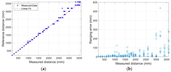 Distance measurements acquired through depth camera: (a) reference and measured distances with linear fit; and (b) ranging error caused by systematic bias.