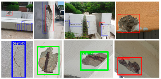 To construct a surface damage detection model for concrete structures, a dataset was constructed by collecting 1000 crack images, 1410 delamination images, and 292 exposed rebar images. Eighty percent of the dataset was used for learning to build the detection model, and the remaining images were randomly selected and used for verification of the detection model.