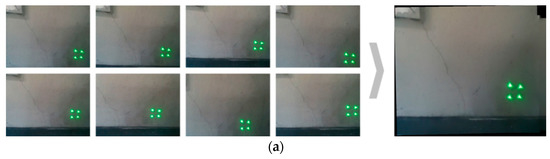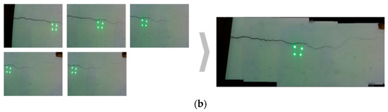 To verify the performance of the quantification including the image stitching technique by considering the calibrated rotation angles of the camera, experimental tests with shear and settlement cracks were conducted. The split images were taken for each crack and homography calculation and image integration were performed, as shown in Figure 9. As shown in Table 2, the advantage of the laser pose calculation that calibrates the captured images is clearly seen.