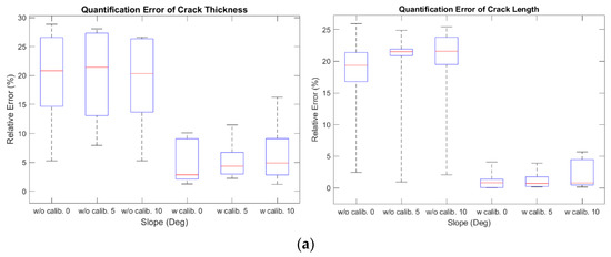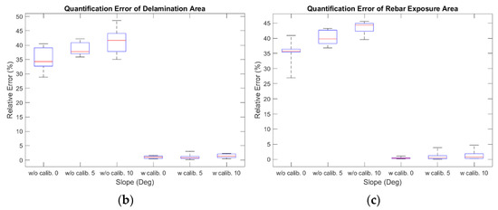 The experimental tests using three types of damages (cracks, delamination, and rebar exposure) were conducted based on the images obtained by varying the angle between the depth camera and the structure (0, 5, and 10 degrees) (see Figure 10). The relative error of the different types of damages and angles are shown in Table 3 and Figure 11. The median of the relative error for thickness and length of the crack were less than 4.87% and 0.83%, respectively; for areas of delamination, it was less than 1.35%; and for the area of rebar exposure, it was less than 0.79%. In comparison to the other types of damage, the relative error of crack thickness tends to be large. This is because the width of a crack is much smaller than the other types of damage, so even an error of the same absolute size is relatively large.