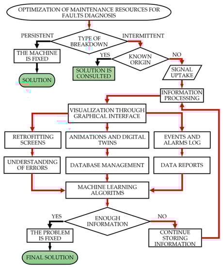 The continuous processing of these data through different machine learning algorithms can offer sufficient information to solve a failure of which the origin was previously uncertain. The scalability in the use of these algorithms guarantees an optimal management of the fault prognosis [23]. Finally, if the fault diagnosis system still does not have enough information to solve the problem, it will continue collecting data, repeating the process described above.