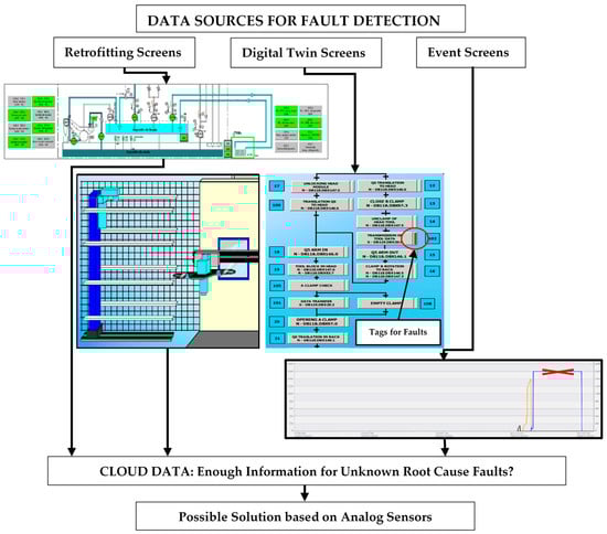 The methodological approach is based on the challenge of foreseeing faults with an undetermined origin. The first step is the development of a preventive and predictive maintenance procedure integrated in the SCADA system. This procedure analyzes the sensor and actuator database from three data sources: retrofitting, digital twin and event SCADA screens. The IIoT physical support, which facilitates data collection from different sources within a diverse operational environment, is an Open Platform Communications (OPC) system [25,26]. The developed environment is a response to the majority of failures, as their origin becomes known [27,28]. However, some faults and their root causes remain unknown [29]. The analysis of these abnormal situations leads to the decision to change from digital to analog sensors in specific machine variables. The novel features added to the anomaly detection procedure improve fault prognosis. Finally, for resolving hidden faults, fundamentally those related to the malfunctioning of the machine without generating an alarm or event, an unsupervised anomaly detection algorithm is used.
