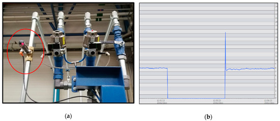 After installing the analog flowmeter, the monitoring interface was able to control in real-time the real flow through the coolant pipe. Figure 7a shows the sensor installed in the pipeline and Figure 7b shows a graphic with the pressure flow measurement.