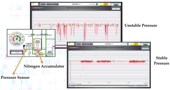 Figure 8 shows the hydraulic circuit and measured data in the pressure sensor of the analyzed system. The sensor used was the same analog sensor as previously (SA5000 from IFM), which can be programed as an analog flowmeter or an analog pressure meter.