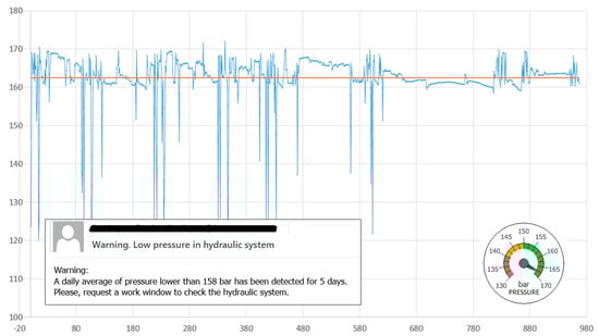 The value of the arithmetic mean and its evolution can be used as an indicator of the wear of the pump and the accumulator. In our case study, for the detection of a continued decrease over time, a daily average lower than 162 bar was set as a standard, and if maintained over five days it would lead to a request for a time window to intervene in the machine and check the status of the hydraulic system. On the other hand, a standard deviation greater than 3.25 was set to trigger a review notice and activate preventive maintenance; a deviation greater than 3.75 bar was set to trigger a notice for high priority maintenance action.