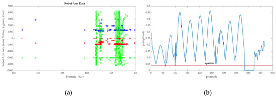 The results can be observed in Figure 10a,b. Figure 10a shows the data distribution, with the pressure in bars on the x-axis and the three-dimensional robot arm position (XYZ) on the y-axis. Figure 10b shows probability results, analyzed as a multivariate Gaussian distribution.