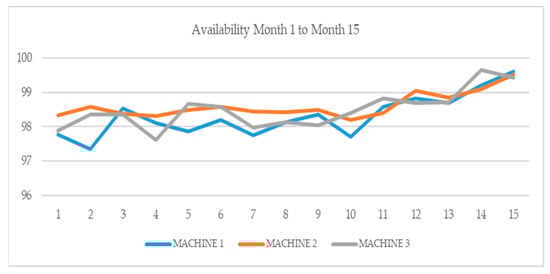 Table 2 and Figure 11 show the availability improvement of three different machine tools in machining processes of chip removal over fifteen months in 2019 and 2020, after the implementation the proposed system.