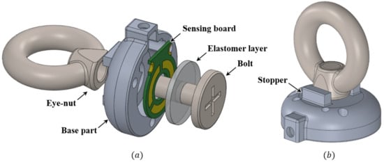 In the proposed sensor, the capacitance measurement part for measuring the three-axis force/torque is configured as shown in Figure 2. It consists of the base part, the sensing board, three sensing cells on the board, the head of the bolt connected to the eye-nut, and the elastomer layer. In this configuration, the capacitance between the three sensing cells on the sensing board and the bolt head acting as a ground is measured. The elastomer layer between the two parts prevents a short circuit and ensures the elasticity of the proposed sensor. The simplicity and compactness of the proposed sensor structure is achieved by this elastomer layer.