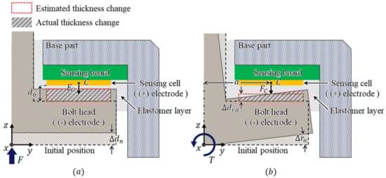 As shown in Figure 3a, when the force F perpendicular to the bolt head of the sensor is applied, the force in the sensing cell is applied to the elastomer layer. Accordingly, the bolt head displacement is calculated using Equation (2) in the normal direction. Next, as shown in Figure 3b, when the torque T is applied to the bolt head, the normal force can be calculated as , where a represents the distance from the Z-axis to the center of the sensing cell. In this case, the angular displacement occurs as a result of the applied torque, and the capacitance also changes. The actual thickness change is in the form of a trapezoid. However, it can be estimated as a rectangular form. Therefore, the thickness change can be calculated using Equation (2), in the same way as in the case of the normal direction force []. Therefore, the capacitance change is calculated using Equation (1) with the changed thickness d, as follows: