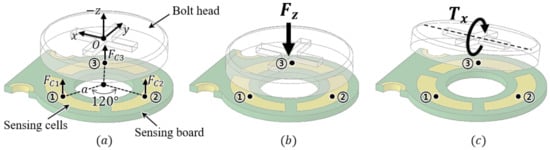This concept of capacitance measurement through changes in thickness can be extended to the measurement of the three-axis force/torque, as illustrated in Figure 4. In this figure, to ease understanding, the sensor is reversed to represent the head of the bolt upward. The proposed sensor measures the change in capacitance between the three sensing cells on the sensing board and the head of the bolt, as shown in Figure 4a. The three-axis force/torque can be measured using this proposed structure of the sensing cells []. The aspect of changes in capacitance in the sensing cells is related to the change in the size of the gap between the three sensing cells and the head of the bolt, as illustrated in Figure 4b,c. When a force in the direction of the Z-axis is applied to the bolt head, the sizes of all the gaps between the bolt head and the sensing cells change equally depending on the direction of the force, as shown in Figure 4b. Accordingly, the capacitances of the three capacitors change as opposed to the size of the gap. When torque in the direction of the X-axis is applied, the size of the gap between cell 1 and the bolt head changes. At the same time, the size of the gap in cell 3 changes inversely. The overall size of the gap in cell 2 does not change if ideal. Similarly, when torque in the direction of the Y-axis is applied, differences in the sizes of the gaps between cells 1 and 3 and the bolt head have the same aspect, and the aspect of the gap size difference in cell 2 is opposite to that of cells 1 and 3. These relationships are summarized in Table 1.