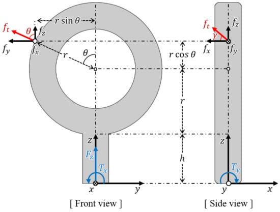 In Equation (13), and can be measured by the sensor, and r and h are designed values. Thus, the rotated angle can be calculated. The sensing point of the applied forces is limited to the circumference of the eye-nut’s ring. Therefore, the position of the sensing point is determined.
