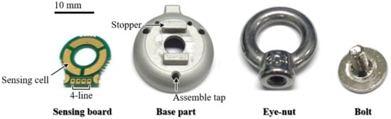 As shown in Figure 7, the sensor has only four real components, which are assembled through a simple process. In the sensing board, four lines for communication are configured, and a capacitance-digit-converter (CDC) chip (AD7147, Analog Devices, Wilmington, Massachusetss) is placed on the backside to measure the capacitance of the three sensing cells. The digitized capacitance data from the CDC chip are transferred to the computer through a microcontroller (MCU) chip and a controller area network (CAN) communication bus. The bolt and the eye-nut are ready-made in the size of M4, and the base part is made of aluminum 6061 alloy.