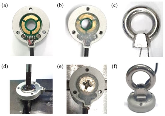 The sensor is fabricated in six steps using these components, as shown in Figure 8. First, the sensing board part is attached to the base part through two semicircular holes. A silicon adhesive (KE-45T, SHINETSU, Tokyo, Japan) is then applied to create an elastomer layer between the electrode of the sensing board and the bolt. This layer’s thickness is designed to be 0.5 mm. To ground the eye-nut and the bolt to the base part, the conductive wire is inserted into the hole of the eye-nut. The bolt is then inserted into the hole of the sensing board and the base part, and it is tightened to the eye-nut. By using spacers, the size of the gap between the eye-nut and the base part is maintained at 0.5 mm, after which the adhesive between the bolt and the base part is coagulated for approximately 6 h, and the same adhesive is applied to this gap. The sensor is fabricated through the process described above. The fabricated sensor is compact and has a diameter of 20 mm and a height of 29 mm. The sensor has only four main components. Therefore, at 14 g, the sensor is significantly light. In addition, the eye-nut and bolt are common ready-made products, and the sensing board and the base part are cheaply manufactured, so the production of the sensor is inexpensive.